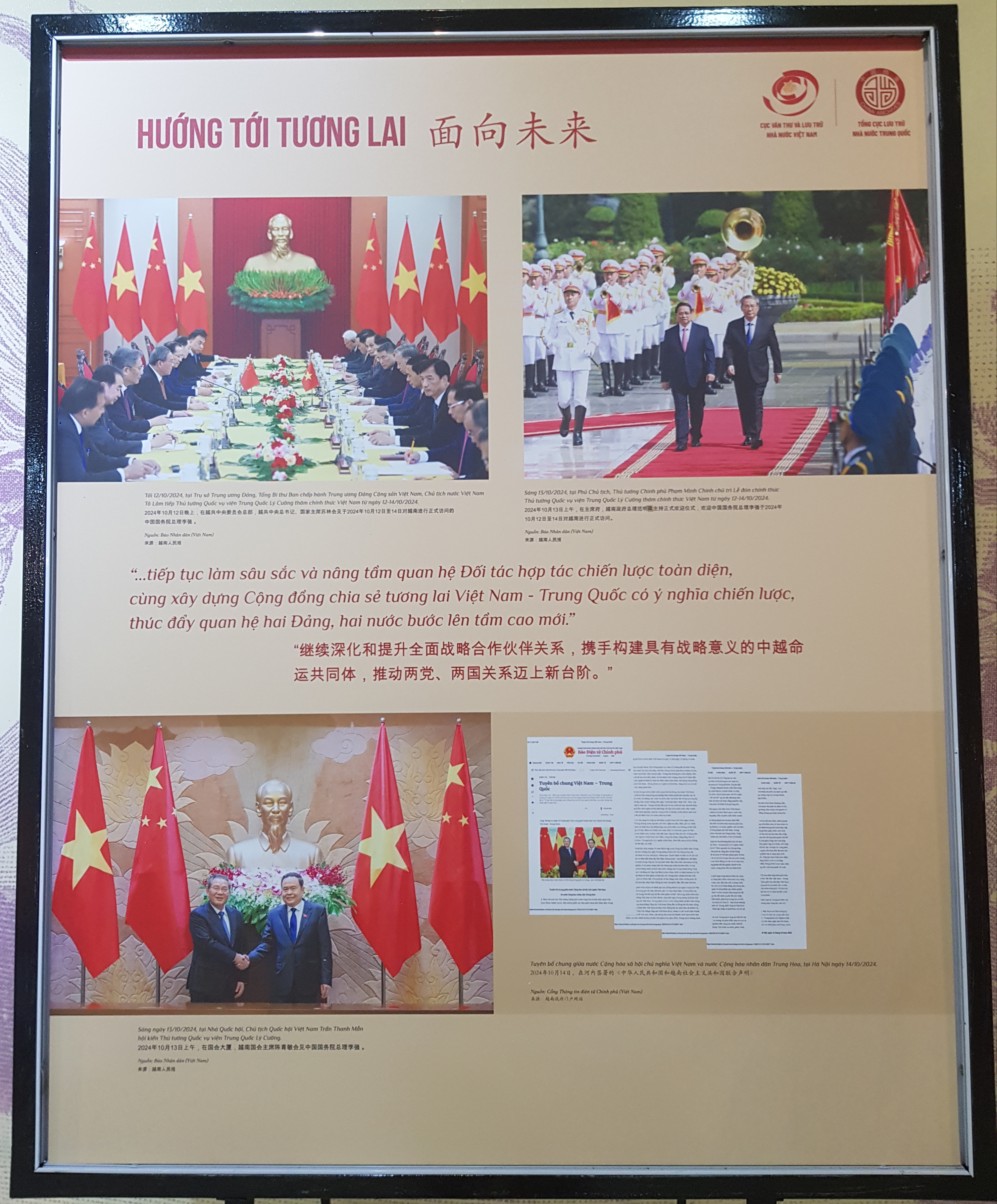 本次展览展出112份文件、档案和图片,均选自越南国家文书与档案局、中国国家档案局、两国媒体机关及相关机构的档案。展览分为三个部分。第一部分奠定友好关系的基础;第二部分合作与发展;第三部分面向未来。
