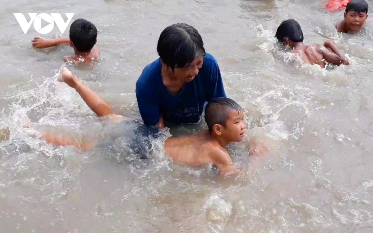同塔省塔梅县宣教局副局长阮氏鹤分享说:“尽管年纪大了,但六期老太仍在教孩子们学游泳,