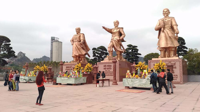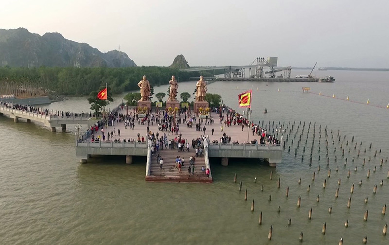 除了祭祀吴权王、黎大行皇帝和兴道王陈国俊的3座庙宇外,遗迹区还修建了陈列馆、长泾竹林寺、圣母庙、胡志明主席祠堂等多个工程。其中,最引人注目的是2017年竣工的胜利广场。广场建在白藤江上,上面摆着吴权王、黎大行皇帝和兴道王陈国俊3尊高11米的铜像。