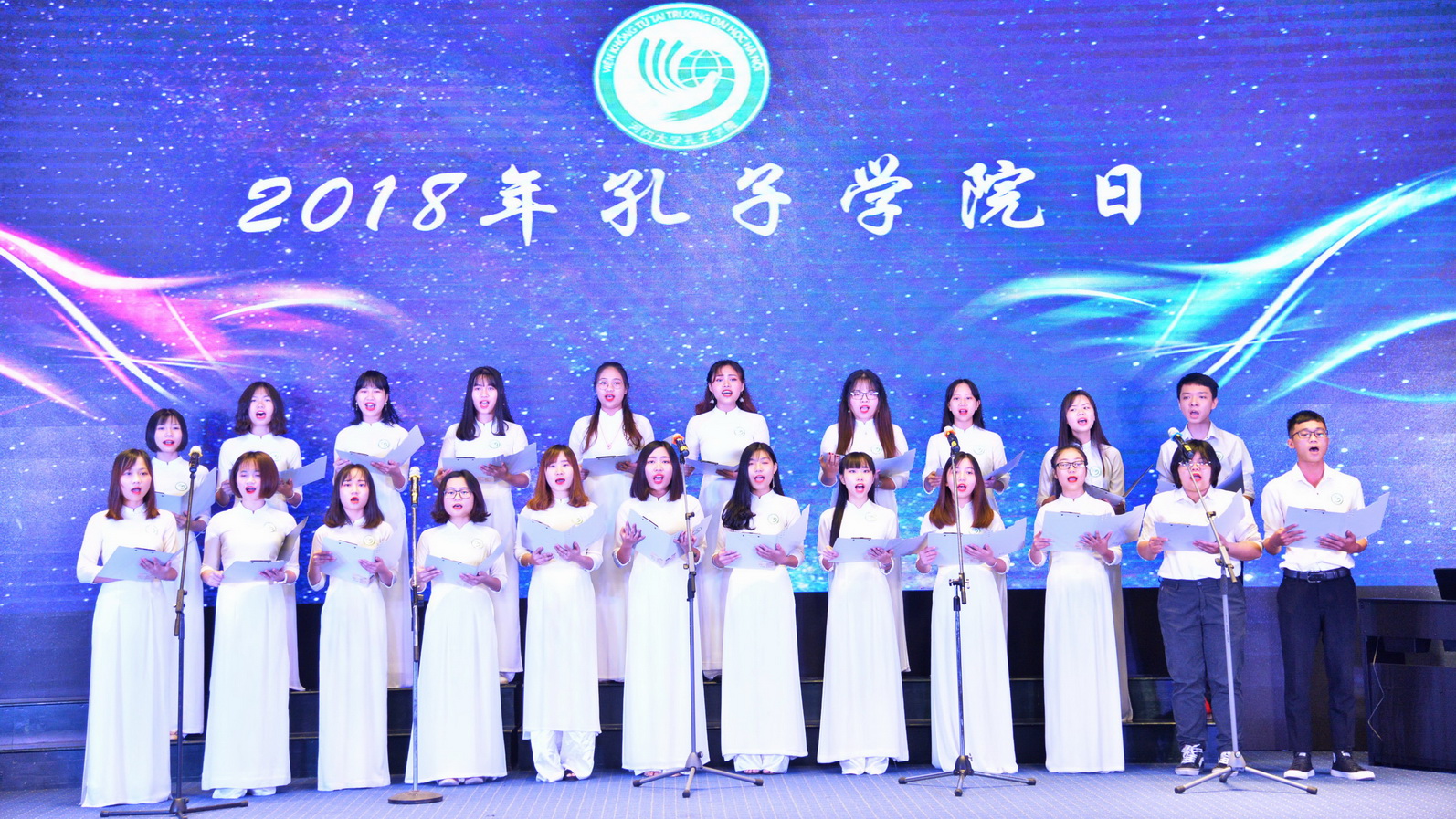 孔子学院合唱队在最近举行的首届越南北部大学生中华才艺大赛上表演献礼节目时的美妙歌声令人印象深刻。合唱队是孔子学院成立并运行的5个俱乐部之一。除此之外,还有武术俱乐部、书法俱乐部、舞蹈队等。