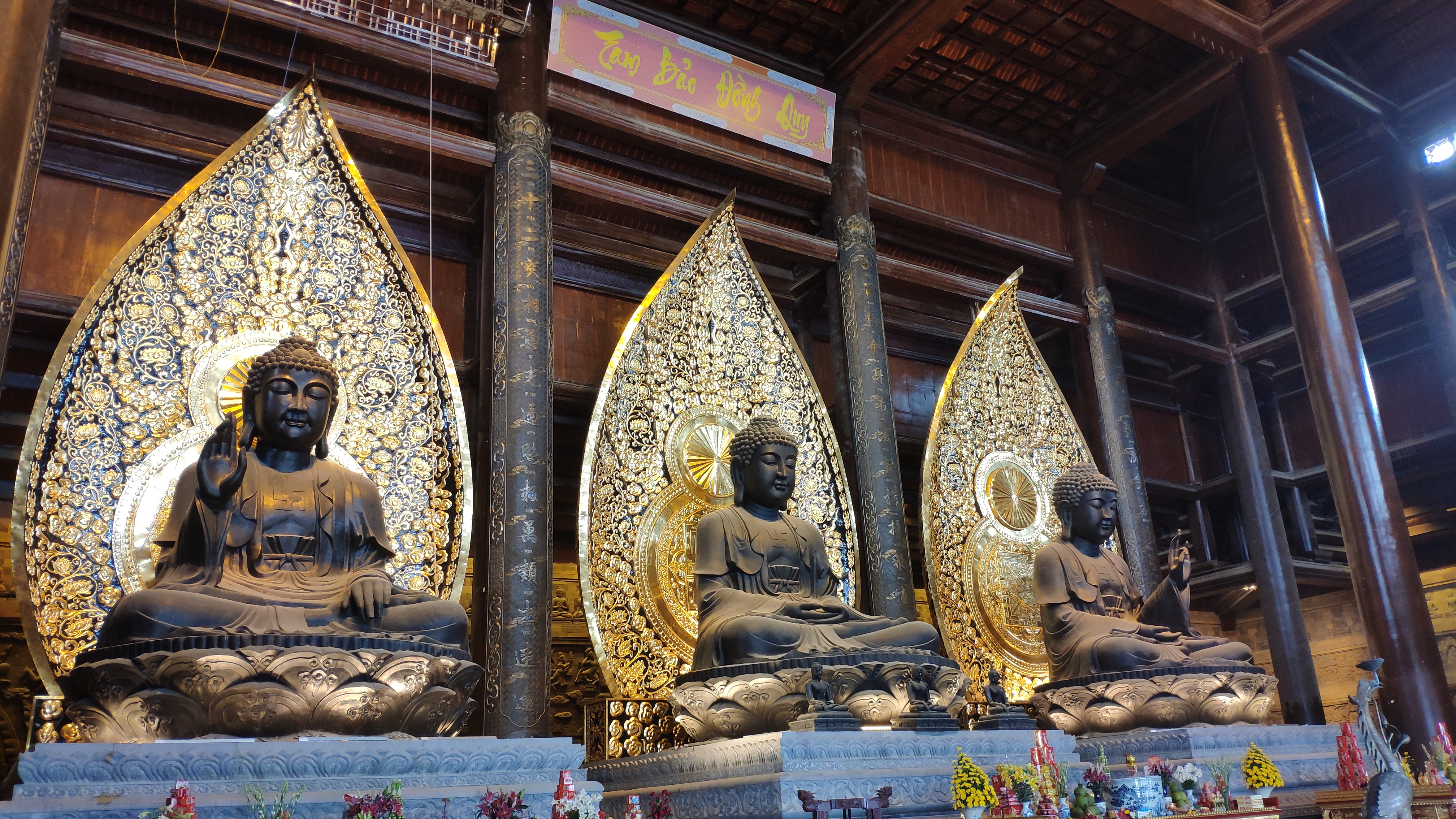 三宝殿是三祝寺最大的殿,面积为5100平方米,能容纳5000人。三宝殿高45米,其屋顶为三层式,典型的越式寺庙风格。在静谧的空间中,穿过精致的木雕门,来到正殿,这里安放三尊大佛,每尊重80吨,坐在重30吨的莲花台上,代表过去、现在和未来。