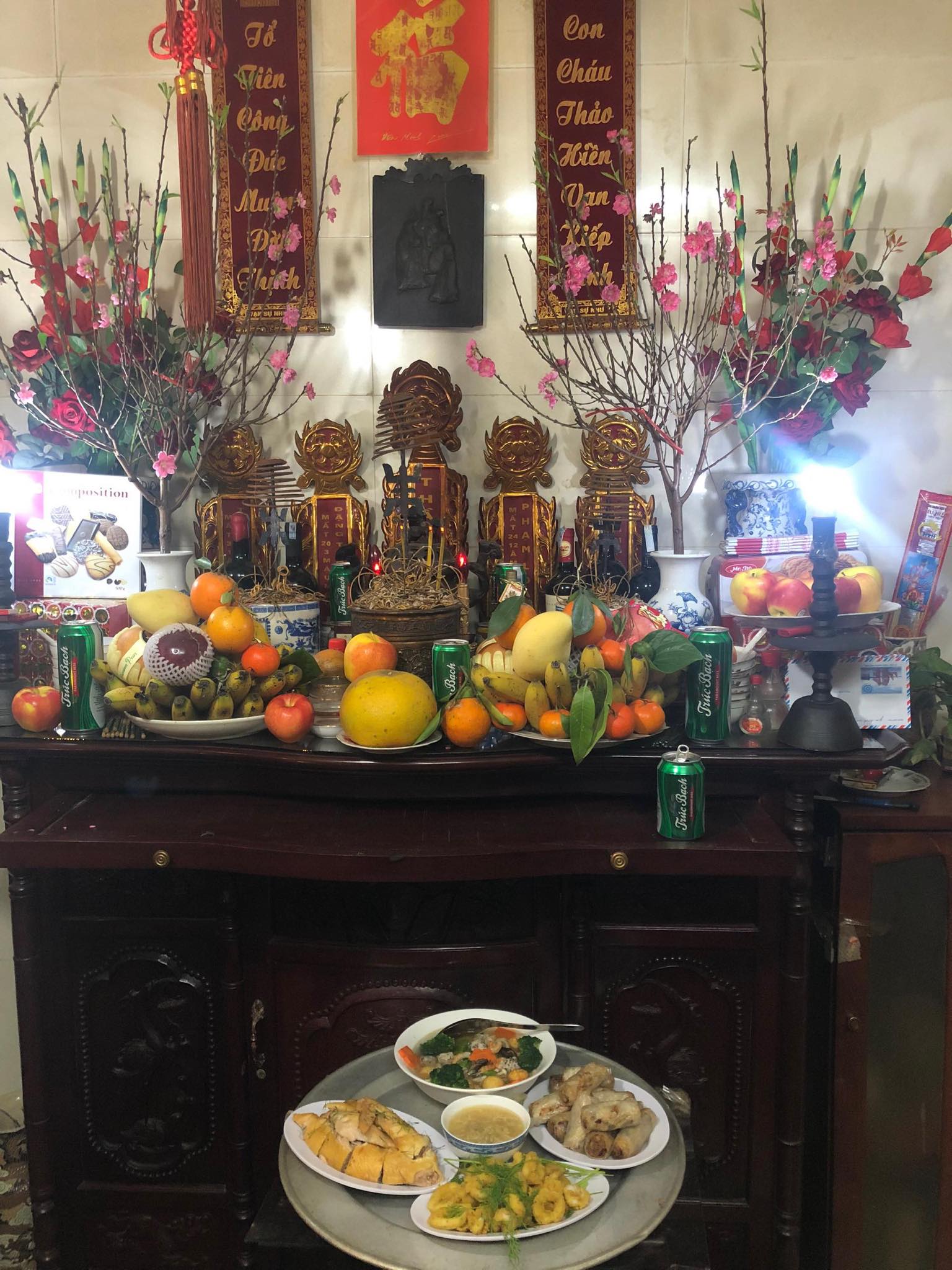 2年間続いた新型コロナウイルス感染症の抑制後、はじめて、今年、外国に留学しているハさんの息子が一時帰国し、家族の団らんが図られました。家族全員が先祖の祭壇に線香を手向け、礼拝した後、テトのご馳走を食べながら、団らんしています。
