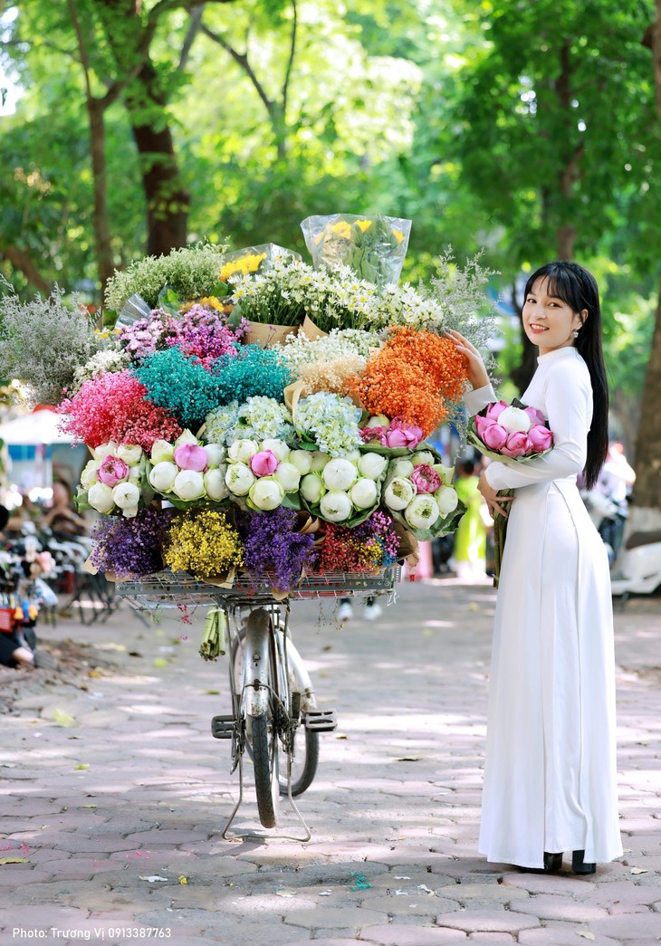 最近では、バーディン区のファン ディン フン通り、ホアン ジエウ通り、チャン フー通りなどの並木道、またはクア バック教会、大聖堂、タンロン皇城遺跡などの古い建築物は、秋の美しい瞬間を写真に収めようとする多くの市民にとって最高の場所です。あざやかで色とりどりの花を手に、優しく優雅なアオザイを着た女性たちが、カメラの前で夢中にポーズをとる姿は、その道路や街角をより美しく、詩的にしています。秋になると、ハノイの人々の心も落ち着いてくるようです。