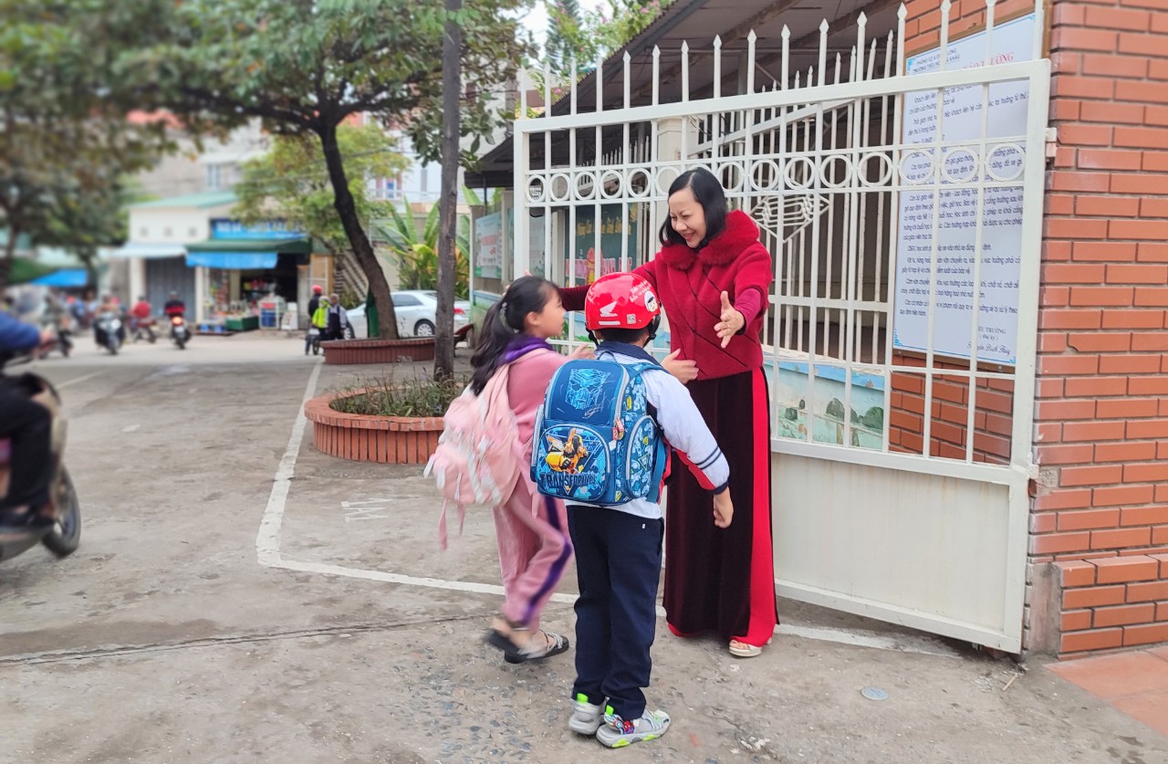 グエン・ビック・トゥイ校長が生徒を迎える習慣は、「幸せな学校」モデルが導入される前から10年以上にわたり、彼女が勤務するすべての学校で続けられてきました。これは校長自身が学校や教室への愛情を生徒や教師一人一人に広げる方法でもあります。校長不在の場合は、副校長や教師が生徒を迎えます。ハーカウ小学校のグエン・フォン・ニュン教師は次のように話しました。