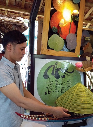 ハスの葉でできた菅笠は自然の美しさとフエ市の職人の腕輪の器用さを結合させるものと言えます。これはベトナムの独特な製品でもあり、国内外の人々に愛用されています。