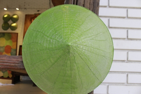 ハスの葉でできた菅笠の丈夫さはラタニアの木の葉でできた菅笠という従来のものと劣らないですが、ハスの葉でできた菅笠は実用のものより、展示や演奏に使うことに見合います。タオさんは次のように語りました。