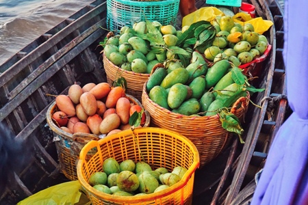 船には大量の商品を積んでいて、業者の船が卸売の船につけて売買を行います。果物は購入したらその場で皮をむいてもらうこともできるので、試食も可能です。