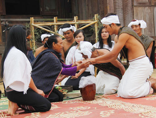 チュル族の独特な文化のもう一つは結婚に関する習慣です。母系社会なので、女性は結婚において主体的な役割を果たしており、今もなお、「夫を捕まえる」という習慣が残っています。女性がある男性を好きになった場合、女性の家族は男性の家族に贈物を持って行き結婚を申し込みます。もし、男性が受け入れなければ、女性の家族は、何とかして男性の指に指輪をはめさせ、女性のために夫を捕まえます。男性がどうしても受け入れられなければ、男性の家族は水牛やお酒などを用意して女性の家族に賠償しなければなりません。これについて先ほどの研究者ルオン・タイン・ソンさんは次のように話しています。