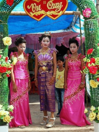「結婚式では、花嫁は、目にも鮮やかな赤かピンクのサンポット・ホールをよく着ます。または、タムポンという赤いドレスを着て、白いマフラーをかける人もいます。また、クパ・プロップと呼ばれる帽子をかぶる花嫁も多いです。クパ・ブロップは、塔の形をしていて、その上には鮮やかなガラス玉が沢山ついていますので、まるで王冠みたいです。花婿も、花嫁の衣装と同じような色の伝統衣装を着ます。また、花婿は、花嫁を守るためという意味で、腰に短刀を携帯します。」