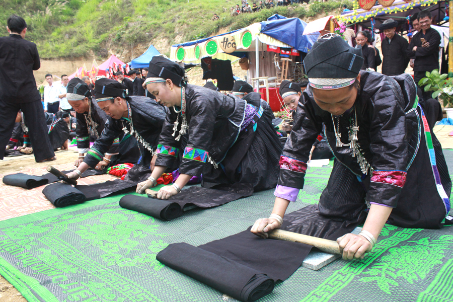 染色の過程は複雑で、ソメモノイモを煮出し、かまどの灰と混ぜ合わせて染料を作ります。この液に布を3〜5日間浸し、取り出しては乾かし、また浸すという作業を20〜30日ほど繰り返します。シンマン村のジ・サオ・ガンさんは次のように語りました。