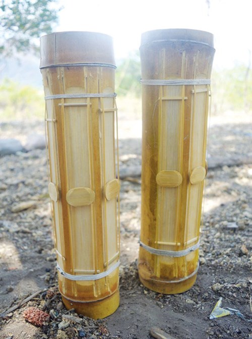 トゥアンさんによりますと、チャピを作るためには、長さ約30センチで、直径10センチ以下の節の一つの竹が必要ですが、この竹の節はその本体が薄いのが求められます。真っ赤に焼けたノミを使って竹の節に穴を開けます。トゥアンさんの話です。