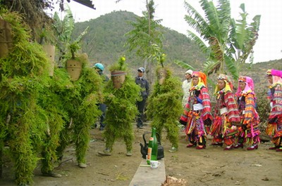 ロロ族の葬儀に欠かせない儀式の一つは、4、5人の若い男性が踊って魂を先祖の元へ見送る儀式で、「魂の舞い」と呼ばれるものです。これらの若い男性が昔の先祖の服装と同様、葉っぱなどで体を装うことから、「森人の舞い」とも呼ばれています。これらの男性は未婚で、踊りが上手な人でなければなりません。魂の舞いは、稲作や、トウモロコシの収穫、米を搗く動作など農作業の活動を再現するのが一般的です。
