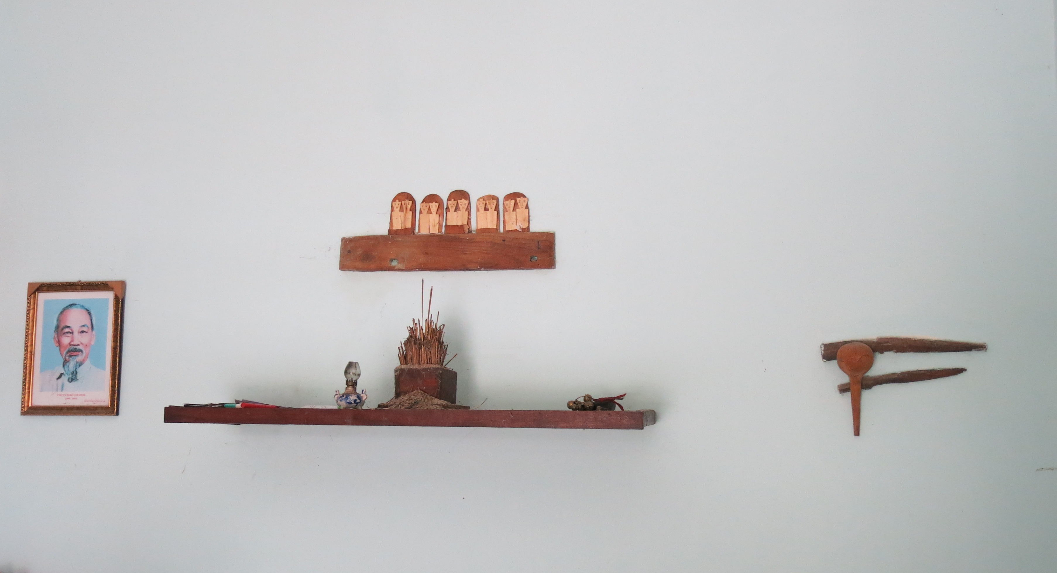 中央の部屋の真ん中に祖先を祀る祭壇を据えます。祭壇の上には、木あるいは竹製の人形が幾つかありますが、それは祖先を象徴するものです。また、ベトナムの建国の父とされるホーチミン故主席も祭られます。先ほどのパオさんは次のように話しました。