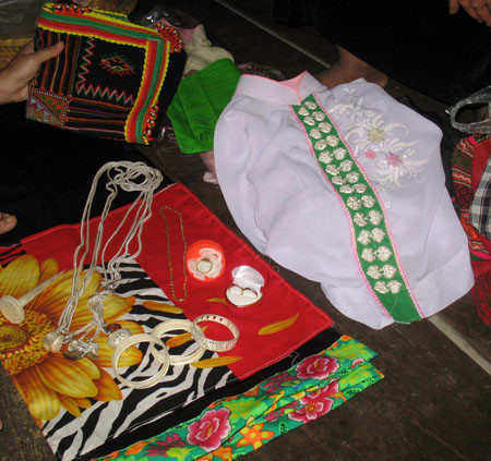 「男性の家族は婚礼用品などをすべて女性の家族に手渡します。これらの婚礼用品は、結婚式に招待された女性の家族のお客さんに配られます。上の人は一羽か半分の鶏を受けるのに対し、下の人は一切れの豚肉を受けます。女性が男性の家へ住み移るとき、これらの婚礼用品を受けた人は、鍋やバスケットなどを贈らなければなりません。」