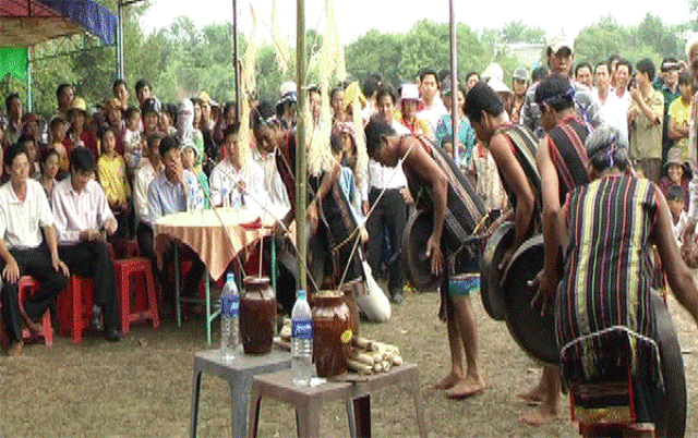 結婚式で、両家族はもちろん、村人全員は、銅鑼を叩いたり、お酒を飲んだりして新夫婦にお祝いをして、楽しいひと時を過ごしました。先ほどのキアさんは次のように話しました。