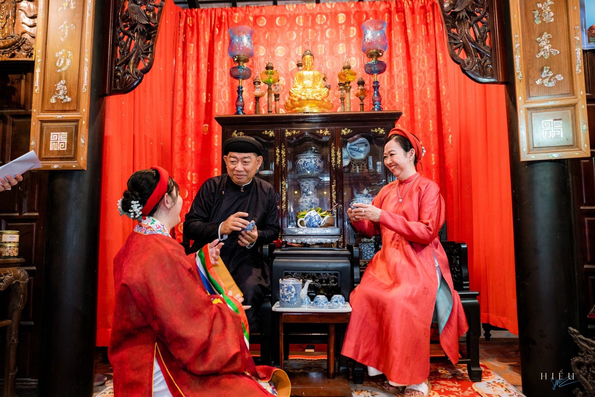 祖父母、叔母、叔父を含む新婦の家族が紹介された後、新婦のラム・トゥオン・ヴァンさんは両親とともに祭壇に線香を手向けて先祖を偲びました。続いて献茶式が行われました。新婦の両親は椅子に座り、新婦のヴァンさんはその隣にひざまずいて、生み、育ててくれたことへの感謝を示すため、ゆっくりとお茶を注いで両親にさし出しました。次に、花嫁は家族の祖父母、叔母、叔父をお茶に招き、みんなの助けと彼女への愛に感謝の気持ちを表しました。