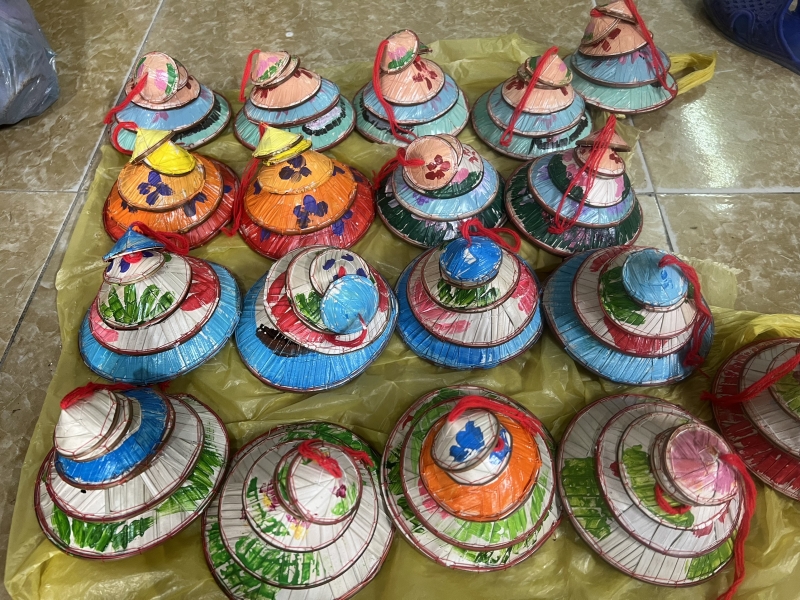 チョオン村のノンラーの中で、最もユニークな物は、フォンさんの発想で作られたシルクカバー笠です。このシルク笠は、従来からの笠にシルクをカバーして、作られたものです。