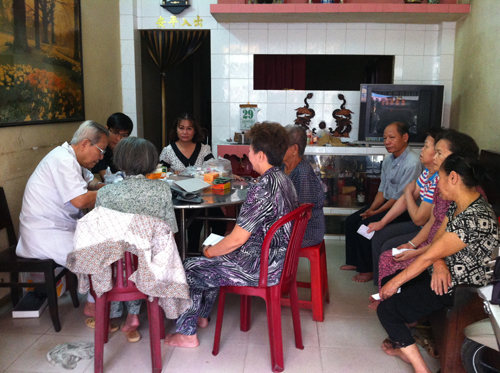 ところで、2012年から、ギエップさんは15号地区人民委員会と連携して、慈善的診療グループを発足させました。それ以来、ギエップさんが主任役となるこのグループは恵まれない人々に診療治療と薬の提供を無料で行なってきました。さらに、年に一度、ギエップさんはホーチミン市のボランティア医師団と共に、地元の貧しい家庭150世帯に「診療祭りの日」を行なっています。特に、お年よりの患者へ訪問診療をしています。その患者の一人であるゴ・ドク・シンさんは次のように語っています。