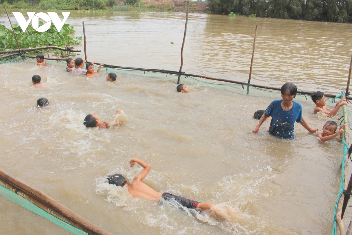 サウ・ティアさんは、子供たちへの愛情を込めて、丁寧に教えています。彼女は子供たちが泳げるようになるまで教えます。チャン・ミン・タンちゃんは、「洪水シーズンになると、私と友だちは、魚釣りや、ネズミとりなどによく行くが、泳げないから、とても怖かった。そこで、サウ・ティアさんの水泳教室に参加することにした。一週間だけで、泳げるようになったよ」と明らかにしました。