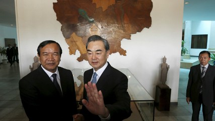カンボジアのプノンペンで、王毅外相(右)とカンボジアのプラック・