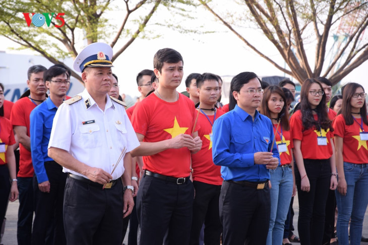 | 出発前に、参加者らは国のために犠牲となった海軍兵士の記念塔で線香を手向ける儀式を行った。 |