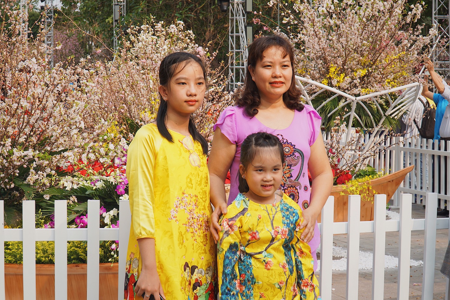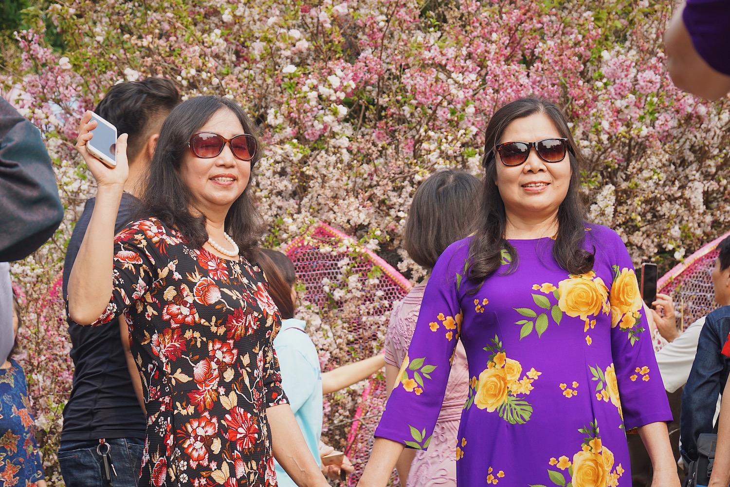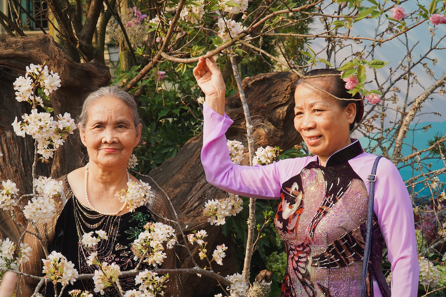 | 桜を背景にしてアオザイの写真を撮る |