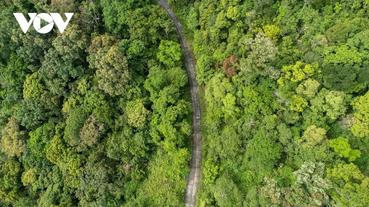 | 上空から見た黄色い花が咲く森の風景 |