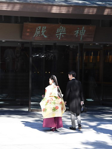 | 結婚式は午前11時半から神楽殿で行われた。(写真:POOL) |
