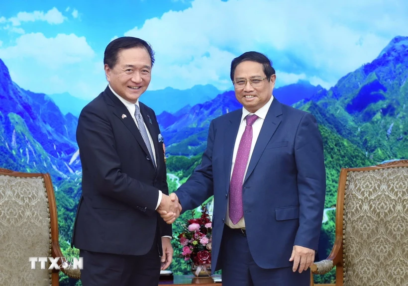 神奈川県の黒岩祐治知事(左)と握手するファム・ミン・チン首相(写真:Dương Giang/TTXVN) |