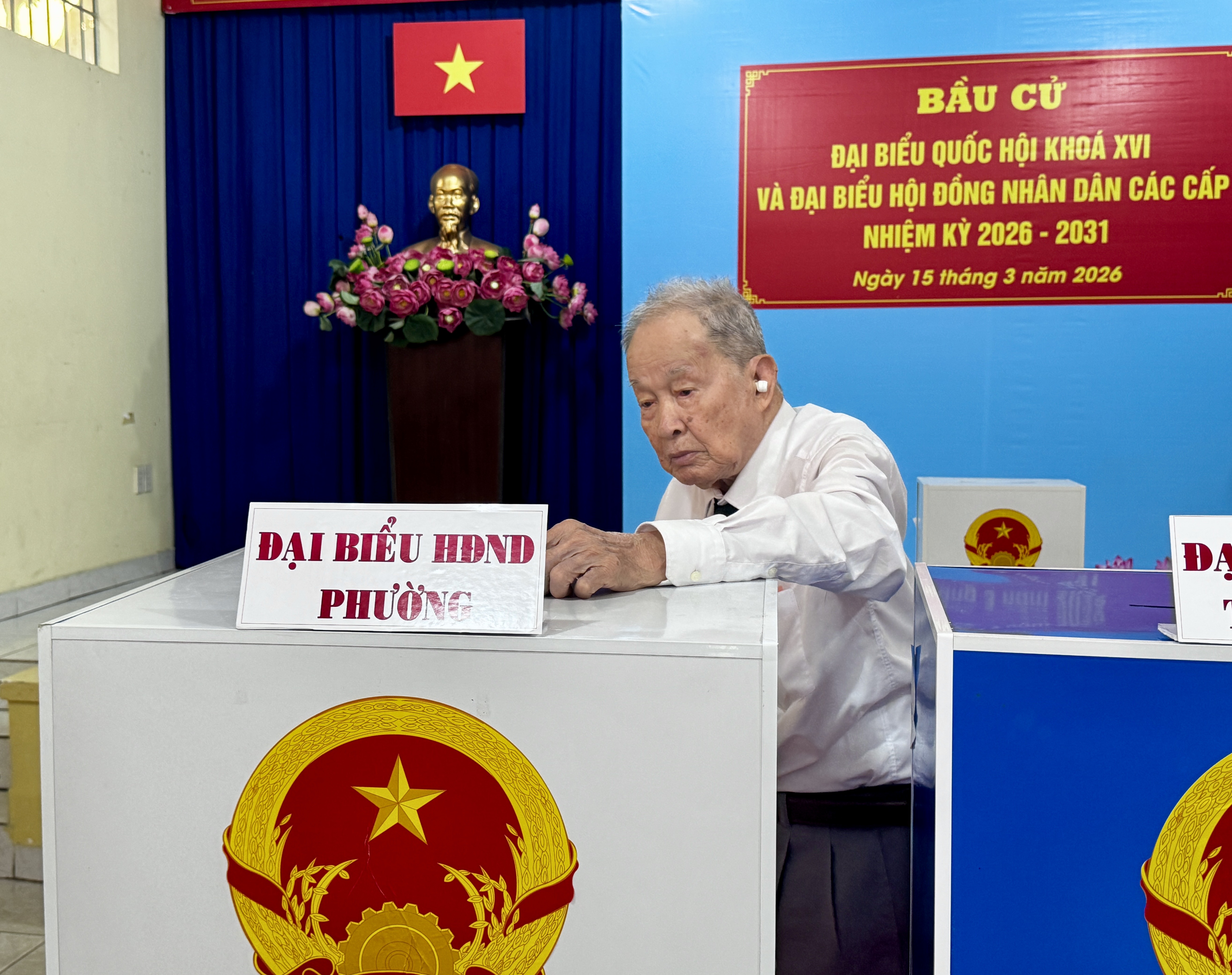 ホーチミン市では、約970万人の有権者が国会議員や各級人民評議会議員の選挙に参加しました。このうち、第53投票所では、かつて戦略諜報部員として活躍した、「人民武装勢力の英雄」の称号を持つ、98歳のグエン・ヴァン・タウ氏も姿を見せ、一票を投じました