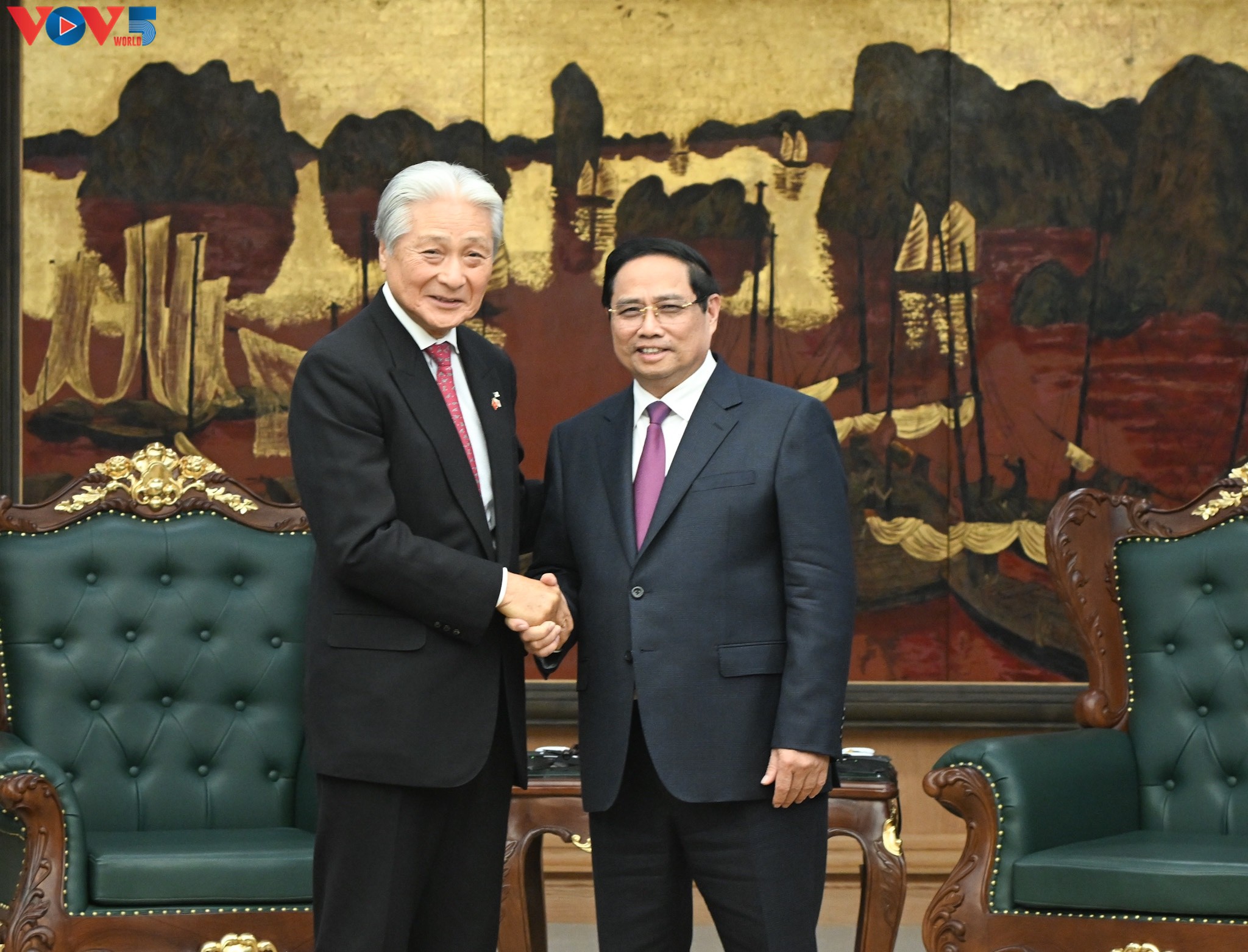 福田富一知事(左)と握手するファム・ミン・チン首相(写真:VOV)