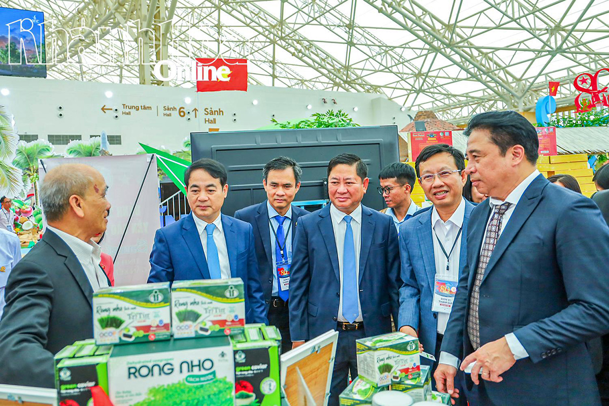 省の指導者たちが展示空間で紹介された製品について説明を受ける(写真:baokhanhhoa.vn) |