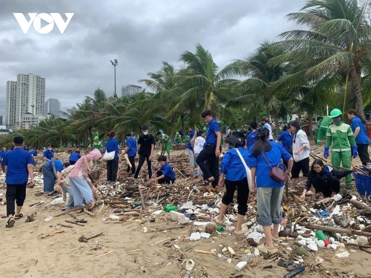 豪雨後、中部カインホア省ニャチャンビーチで清掃活動に取り組むボランティア(写真:Thái Bình/VOV-Tây Nguyên)
