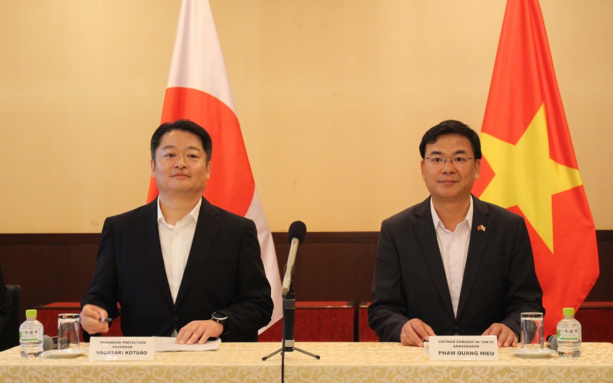 「ベトナム人労働者家族医療傷害保険制度」を紹介する記者会見に出席した山梨県の長崎幸太郎知事(左)と在日本ベトナム大使館のファム・クアン・ヒエウ大使