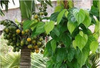 ビンロウジュの実(左)とキンマの葉 |