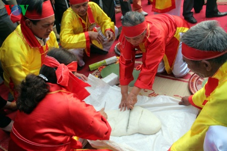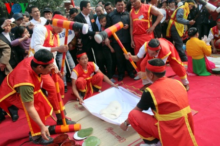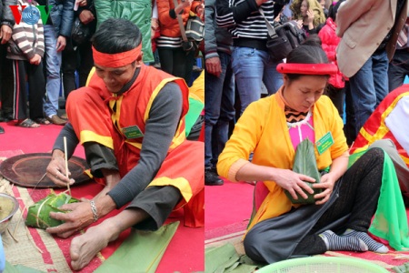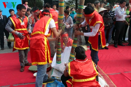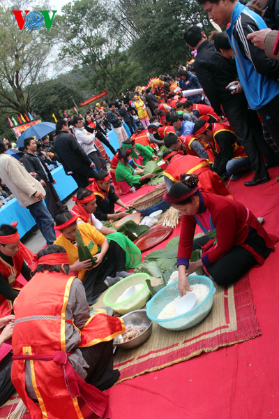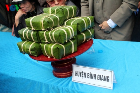 毎年旧暦の1月16日(今年は2月25日)に北部のハイズオン省チリン町コンソン村で、バイチュンとバィンザイ料理コンクールが行われます。今年は、ハイズオン省内の12県から12チームが参加しました。今年のルールは毎年と同じですが、審査はなかなか厳しいです。バインチュンを包む時間は5分、バィンザイを作る時間は20分しかありませんでした。しかし、どのチームも規定内の時間で美味しいバィンチュンとバィンザイを作りました。
