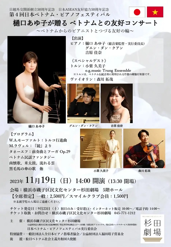 「樋口あゆ子が贈るベトナムとの友好コンサート・ベトナムからのピアニストとつづる友好の輪」と題するコンサートは、日越外交関係樹立50周年と日本ASEAN友好協力50周年を記念して開催され、日越両国の有望な若手ピアニストたちが共演するチャンスでもあります。また、ベトナム文化を体験できる交流ブースも設けられます。