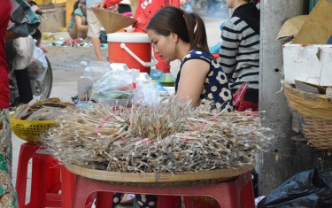 「島にはテト用品がたくさん運ばれています。今年のテト用品は昨年と比べて多くあります。私たちはテト準備のため、お菓子、果物、食品などを買います」