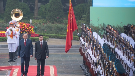 (VOVWORLD) - នាព្រឹកថ្ងៃទី ២៦ ខែមករា ពិធីទទួលបដិសណ្ឋារកិច្ចជាផ្លូវការជូនចំពោះអគ្គលេខាបក្ស ប្រធានរដ្ឋឡាវ លោក ថងលូន ស៊ីស៊ូលីត និងភរិយា រួមជាមួយគណៈប្រតិភូជាន់ខ្ពស់នៃបក្ស និងរដ្ឋឡាវ ក្នុងដំណើរទស្សនកិច្ចផ្លូវរដ្ឋមកកាន់វៀតណាម ត្រូវបានប្រារព្ធធ្វើឡើងយ៉ាងឱឡារិកនៅវិមានប្រធានរដ្ឋ (ហាណូយ) តាមពិធីការខ្ពស់បំផុតសម្រាប់ប្រមុខរដ្ឋ។ លោកអគ្គលេខាបក្ស តូ ឡឹម និងភរិយា បានអញ្ជើញធ្វើជាអធិបតីក្នុងពិធីទទួលបដិសណ្ឋារកិច្ច។
