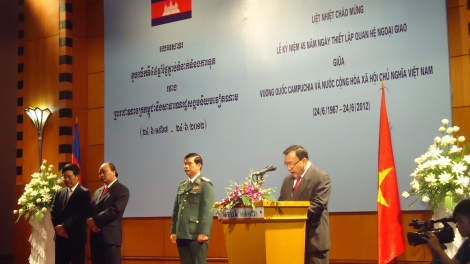 (VOVworld)-ស្ថិតក្នុងក្របខ័ណ្ឌបណ្តាព្រឹត្តការណ៌ ខួបអនុស្សាវរីយ៌លើកទី៤៥ទិវា បង្កើតទំនាក់ទំនង ការទូតវៀតណាម-កម្ពុជា(ថ្ងៃទី២៤មិថុនា១៩៦៧ ថ្ងៃទី ២៤ មិថុនាឆ្នាំ២០១២) នាយប់ថ្ងៃទី២១មិថុនានៅ ទីក្រុងហាណូយវៀតណាមស្ថានរាជទូតកម្ពុជាប្រចាំនៅ វៀតណាមបានរៀបចំពិធីជប់លៀងដ៏មហោឡារឹកដើម្បី អបអរព្រឹត្តិការណ៌នេះ។