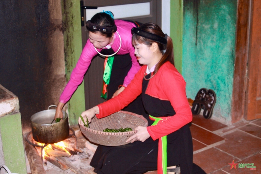 បងប្អូនស្រីជនជាតិ Cao Lan ដាក់នំបក្សី Gau ក្នុងឆ្នាំងដើម្បីស្ងោរ។ (រូបថត៖ qdnd.vn) |