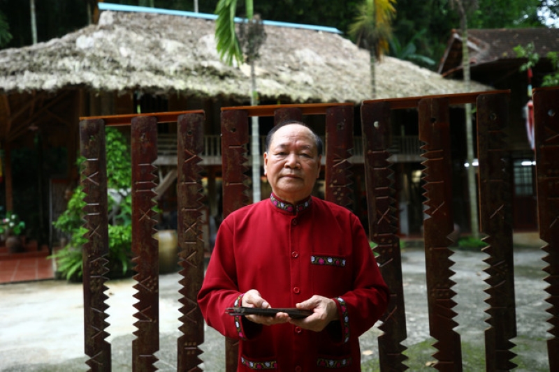 សិប្បករដ៏ល្បីល្បាញ លោក Bui Thanh Binh ជាមួយនឹងប្រតិទិនឫស្សីបុរាណរបស់ជនជាតិ Muong (រូបថត៖ An Thanh Dat/ dantocmiennui.vn) |