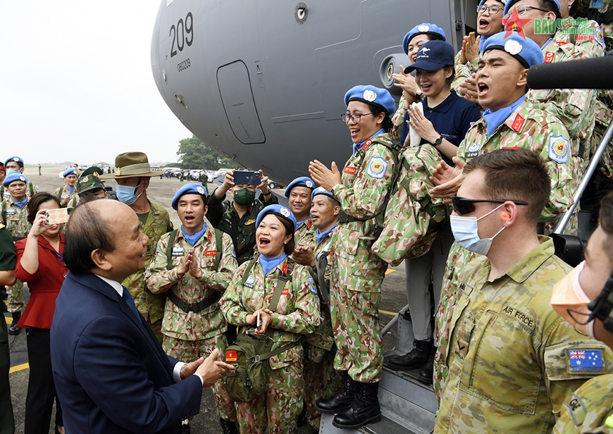 ប្រធានរដ្ឋលោក Nguyen Xuan Phuc និងគណៈប្រតិភូបានអញ្ជើញជូនដំណើរសមាជិកកងពេទ្យកម្រិតទី ២ លេខ ៤ ឡើងយន្តហោះទៅកាន់ប្រទេសស៊ូដង់ខាងត្បូង ដើម្បីបំពេញបេសកកម្មរក្សាសន្តិភាពរបស់អង្គការសហប្រជាជាតិ (រូបថត៖ Tuan Huy/ qdnd.vn) |