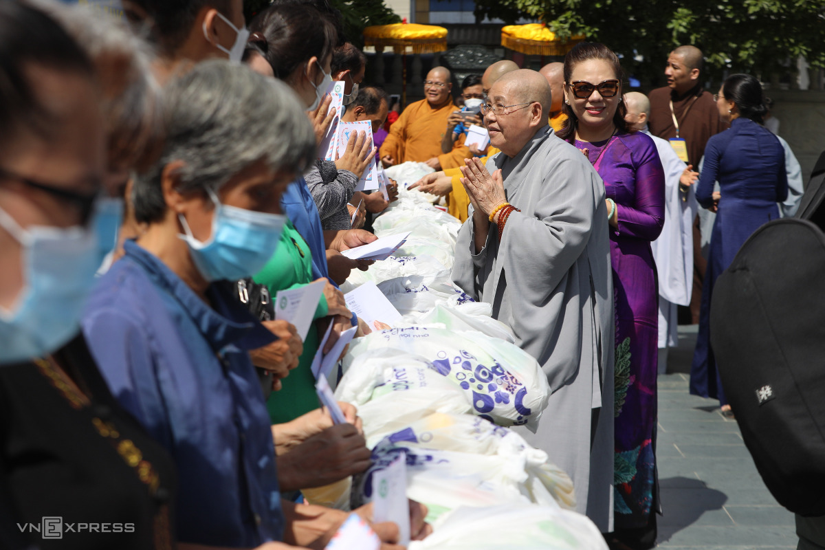 នៅចុងបញ្ចប់នៃកម្មវិធី គណៈអភិបាលនៃសមាគមពុទ្ធសាសនា ទីក្រុងហូជីមិញ បានប្រគល់អំណោយចំនួន ១.០០០ ជូនដល់គ្រួសារដែលមានការលំបាកដោយសារផលប៉ះពាល់នៃកូវីដ-១៩ (រូបថត៖ Quynh Tran/ VNExpress) |