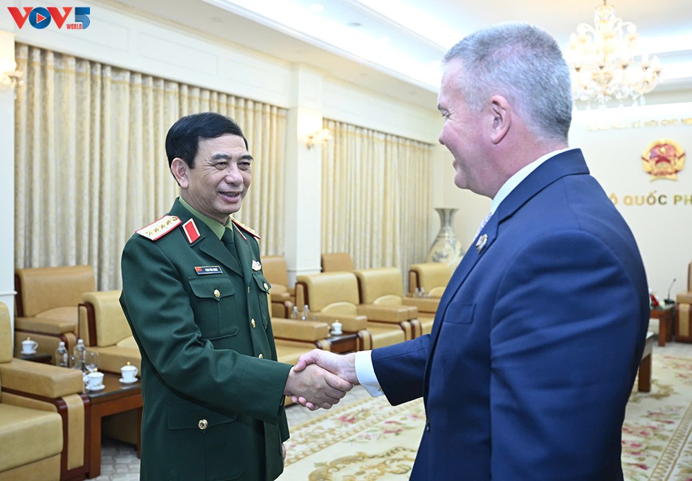 លោកនាយឧត្តមសេនីយ៍ ផាន វ៉ាន់យ៉ាង រដ្ឋមន្ត្រីក្រសួងការពារប្រទេសវៀតណាម និងឧបការីរដ្ឋមន្រ្តីការបរទេសអាមេរិក លោក Michael DeSombre។ (រូបថត៖ VOV) |