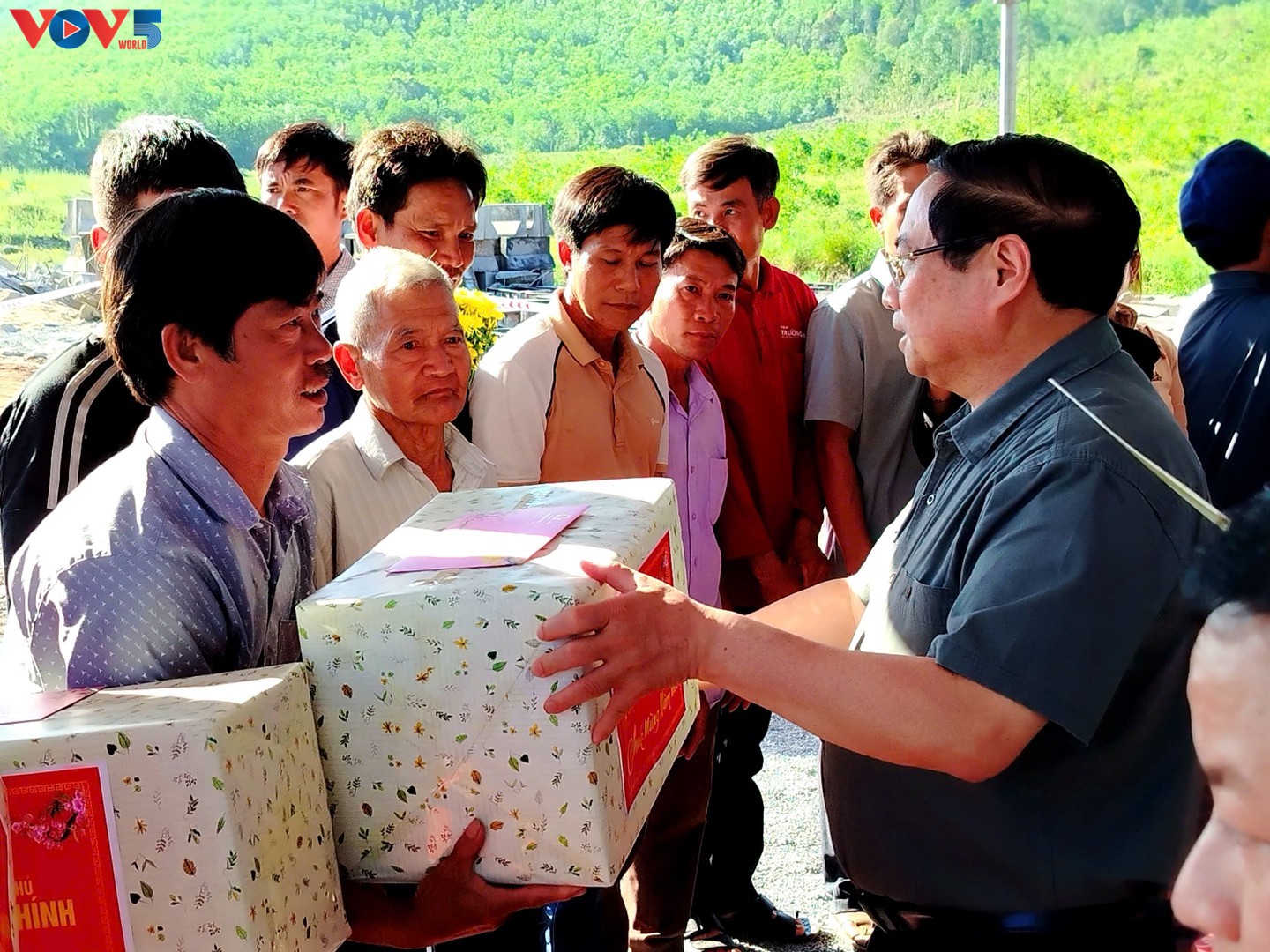 លោកនាយករដ្ឋមន្ត្រី ហ្វាម មិញជីញ សាកសួរសុខទុក្ខ និងសំណេះសំណាលជាមួយប្រជាជននៅតំបន់តាំងទីលំនៅថ្មីភូមិ Quang Duc។ (រូបថត៖ VOV) |