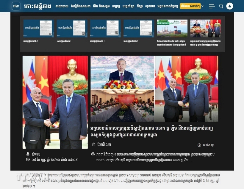 ទីភ្នាក់ងារសារព័ត៌មានកម្ពុជា (AKP) បានចុះផ្សាយអត្ថបទនៅថ្ងៃទី ៣ ខែកុម្ភៈ ឆ្នាំ ២០២៦ ដែលមានចំណងជើងថា "អគ្គលេខាធិការបក្សកុម្មុយនិស្តវៀតណាមនឹងមកបំពេញទស្សនកិច្ចផ្លូវរដ្ឋនៅកម្ពុជានៅចុងសប្តាហ៍នេះ" (រូបថត៖ TTXVN) |