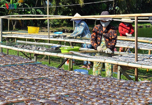 | នៅឃុំ Khanh Hung និងទីរួមខេត្ត Tran Van Thoi មានគ្រួសារកសិករជា ច្រើនដែលប្រកបរបរធ្វើត្រីកន្ធរងៀត។ |