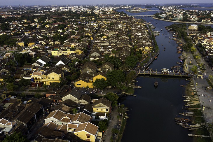មើលពីចំងាយ វិថីបុរាណ Hoi Anលេចចេញមកជាមួយជញ្ជាំងពណ៌លឿងដំបូលប្រក់ក្បឿងពណ៌ត្នោតចាស់លាយឡំជាមួយពណ៌នៃពេលវេលា នៅក្បែរដងទន្លេ Hoai ដ៏រ៉ូមែនទិក
