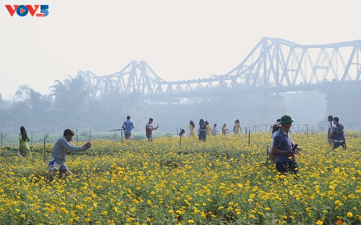 នៅជើងស្ពាន Long Bien ជាប្រវត្តិសាស្ត្រ កំរាលផ្កាដ៏ចម្រុះពណ៌ ទាក់ទាញភ្ញៀវទេសចរណ៍រាប់រយនាក់មកទស្សនា និងថតរូបជារៀងរាល់ថ្ងៃ។